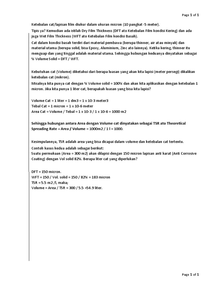 Kebutuhan cat adalah. Misalkan pada cat epoksi mastik dengan solid conent by volum 82 untuk ketebalan 125 micron maka Daya Sebar Teoritisnya sebesar. 6 - 10 meter persegi.